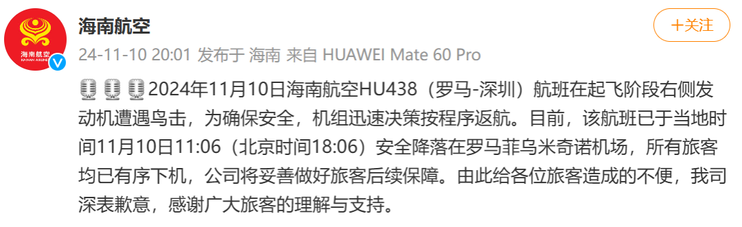 2024年11月10日,海南航空HU438(罗马-深圳)航班在升空阶段右侧发动机际遇鸟击,为确保安全,机组飞速有辩论按门径返航。