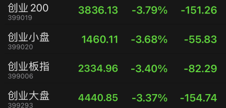 截止到收盘,沪指跌1.73%,收报3379.84点;深证成指跌2.83%,收报11037.78点;创业板指跌3.40%,收报2334.96点。