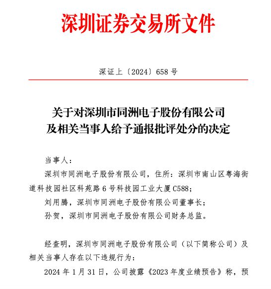 8月13日晚间,深圳证券来回所下发对于对深圳市同洲电子股份有限公司及掂量当事东说念主赐与通报月旦搞定的决定。深交所称,公司未在司帐年度适度后一个月内,涌现股票来回可能被扩充退市风险警示的风险教导公告。深交所决定对*ST同洲(维权)及公司董事长刘用腾、财务总监孙贺赐与通报月旦的搞定。
