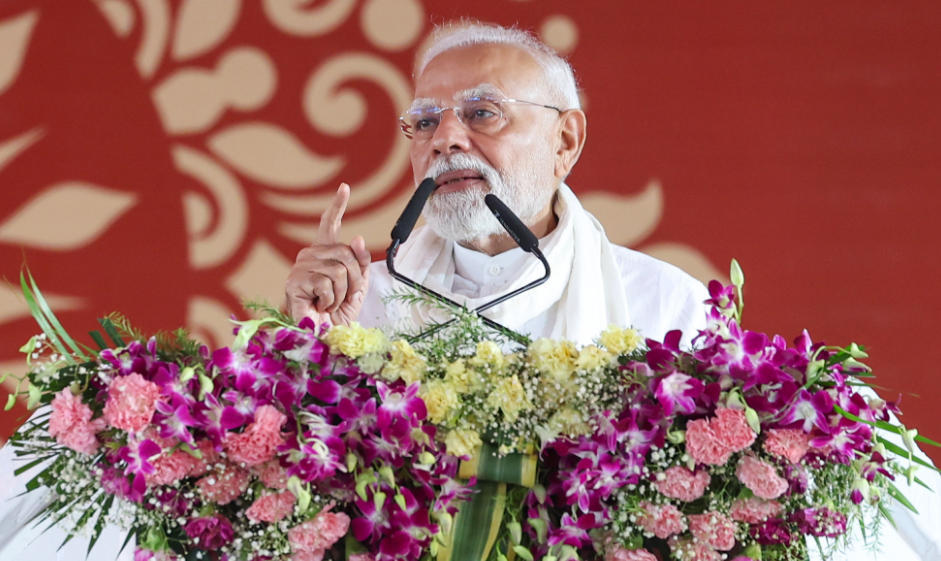 印度总理莫迪8月2日在印度朔方邦城市瓦拉纳西的一个连合上发表语言。(图片来自莫迪办公室网站)